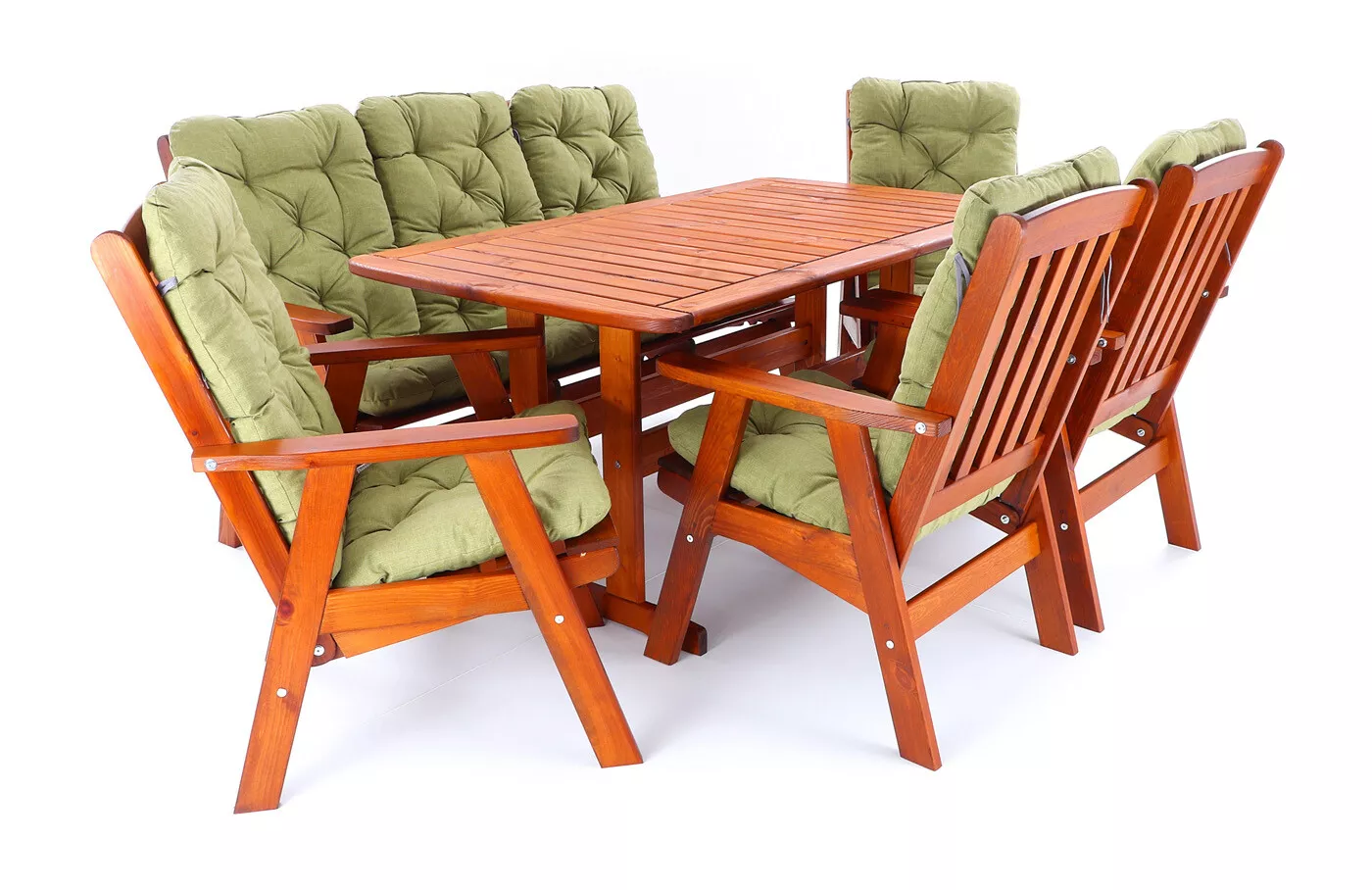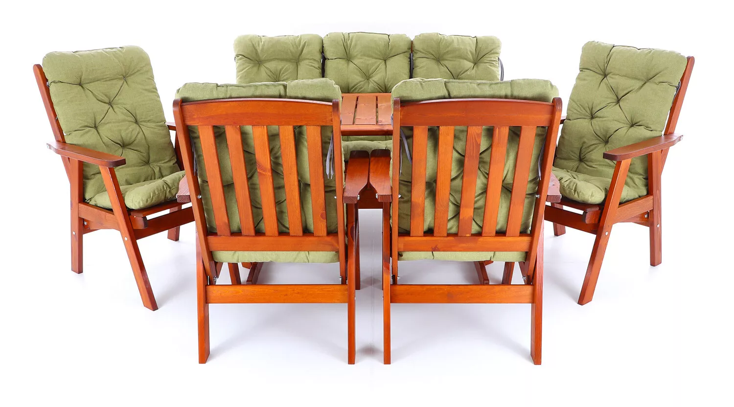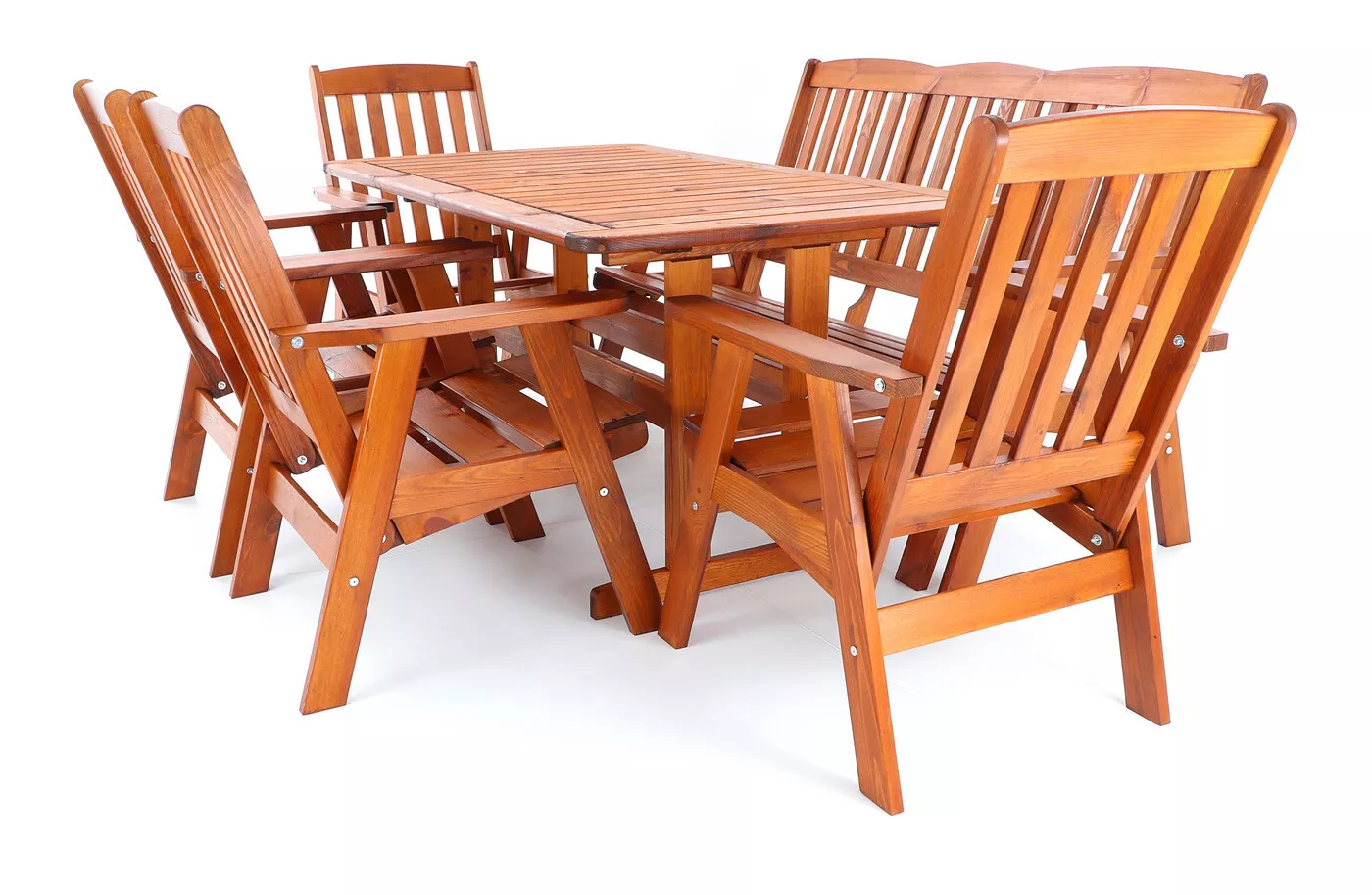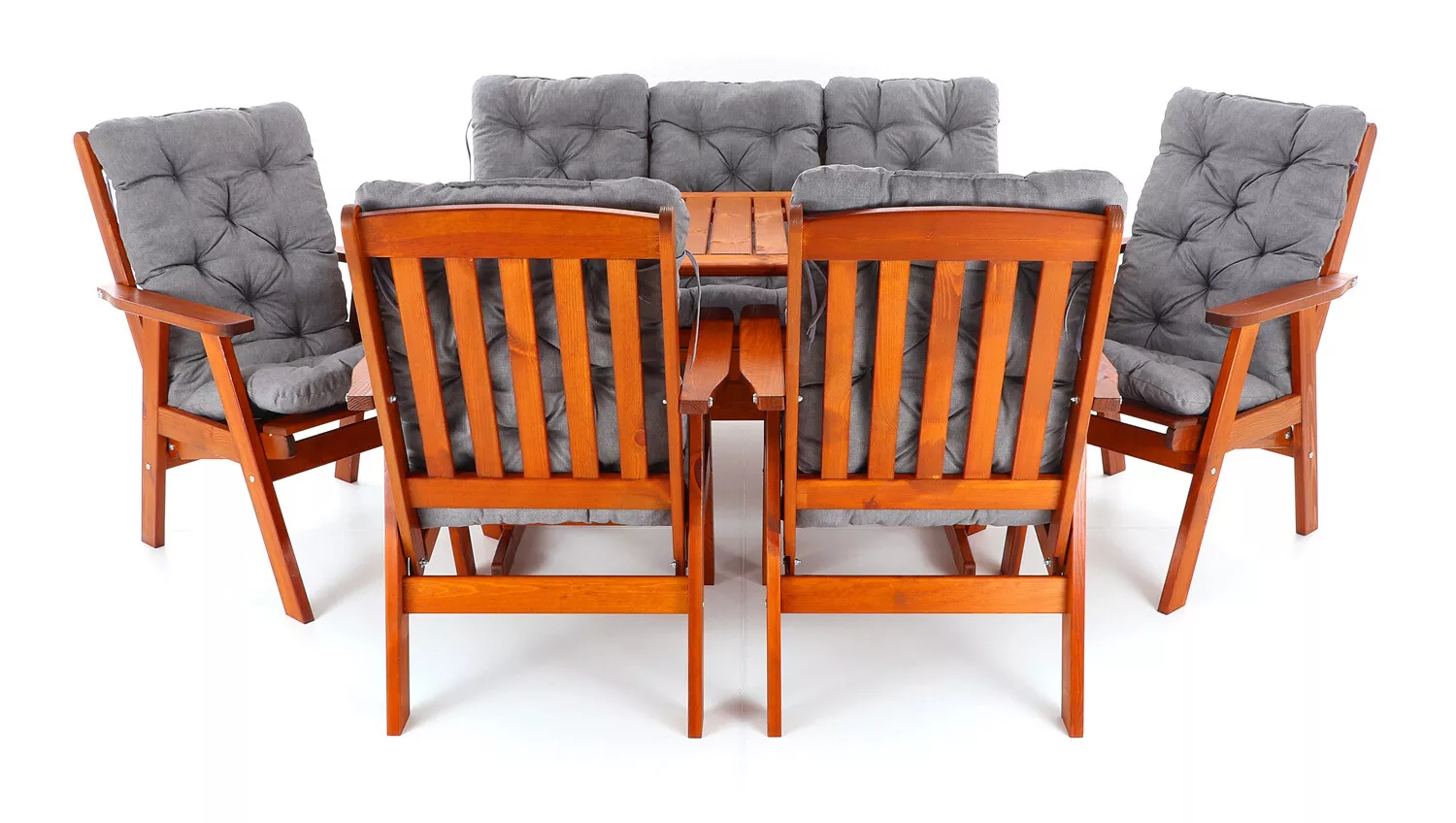 - Luxusní masivní stolová sestava čtyř polohovacích křesel, jedné polohovací lavice a stolu z odolného a trvanlivého dřeva severské borovice. Odolné dřevo a velmi robustní konstrukce řadí tuto sestavu mezi nejmasivnější výrobky ve své kategorii na trhu.