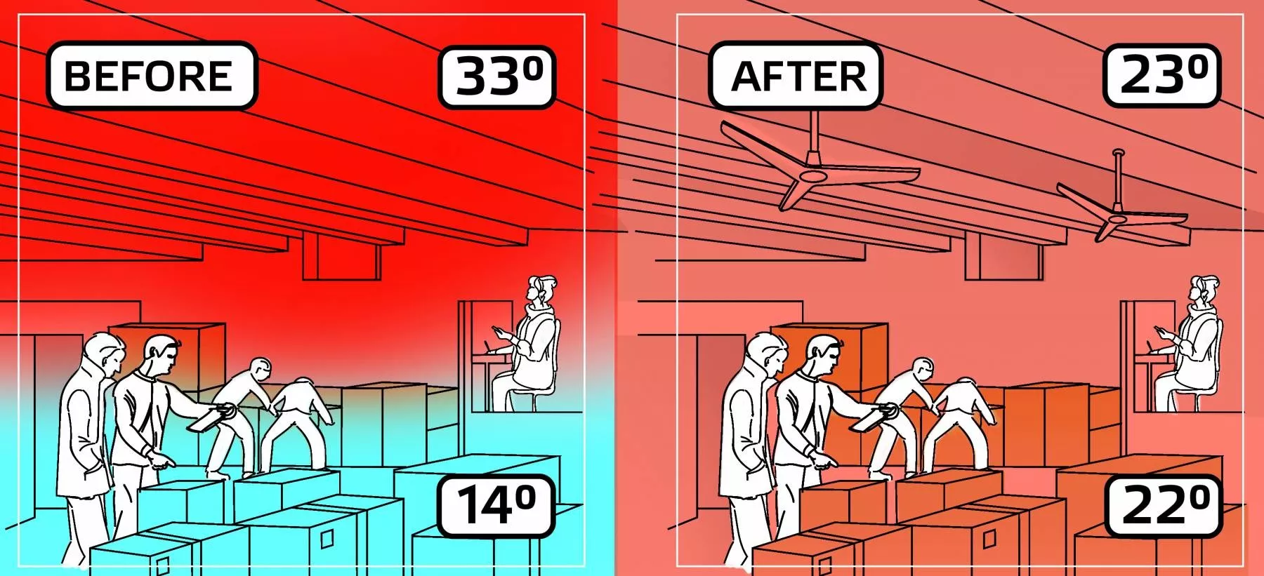 • Teplý vzduch se hromadí pod strojem. Stropní ventilátor Master jej přivádí do spodní části prostoru, díky čemuž ušetříte až 30% energie.