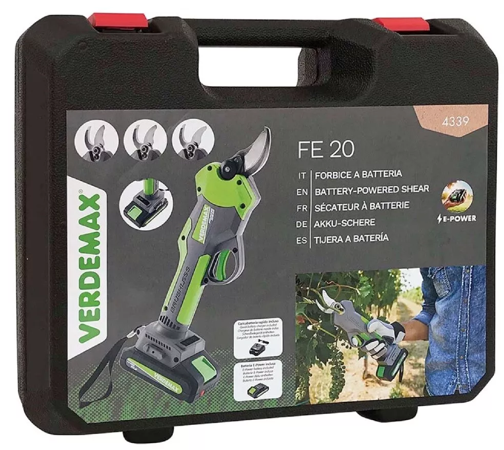 - AKU zahradní nůžky VERDEMAX FE20• Baterie Li-Ion 20V Samsung• Kapacita baterie: 2 Ah• Průměrný počet střihů na jedno nabití: 1300x• Tři pozice průměru střihu: 15,25,30 mm• Čistý řez bez otřepů• Hmotnost: 1,2 kg• Součást balení je nabíječka + baterie Li-ion 20V 2AhSpolečnost Verdemax vyrábí zahradní produkty pod vlastní značkou pro péči, dekoraci, ochranu a údržbu zeleně, a to jak pro fandy, tak pro profesionály v tomto odvětví.Společnost byla založena v 80. letech v Itálii s operačním ústředím v Boretto. Díky širokému spektru produktů se obrací k zákazníkům, prodejcům, zahradním centrům a specializovaným distributorům a nabízí jim především zahradní ruční nářadí, aku program, tlakové postřikovače, rozmetadla, kompostéry, závlahové systémy, dětské nářadí atd. Nabídka produktů se stále rozšiřuje.