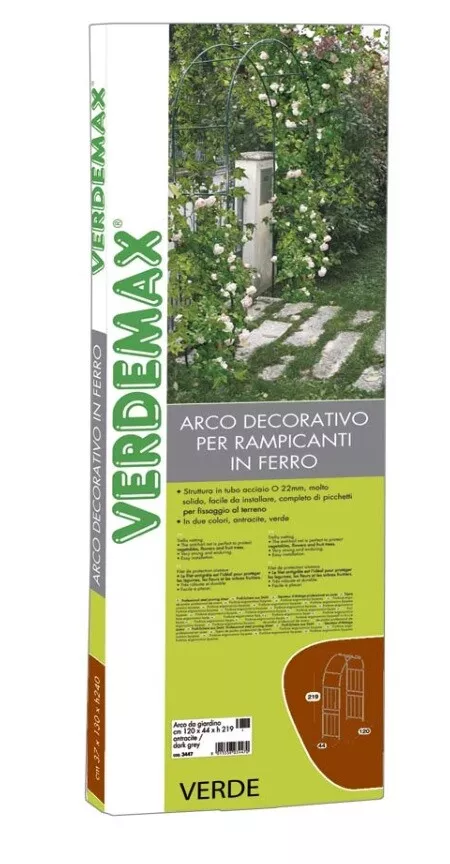 - Verdemax dekorační zahradní oblouk je ideální volbou pro pěstování růží a popínavých rostlin a určitě mu to bude na každé zahradě, dvorku nebo terase slušet. Tento kovový zahradní oblouk je dostatečně pevný, aby poskytl kvalitní oporu vašim popínavých rostlinám. Zahradní kovový oblouk VERDEMAX 3447 Zahradní kovový oblouk VERDEMAX 3447 můžete použít na výzdobu vchodu, nádvoří, chodníku atd. Ideální pro popínavé růže nebo jiné popínavé rostliny. Materiál: ocel povrchově dokončená komaxitovou barvouRozměry: 40x120x219 cmPrůměr trubek: 22 mm. Barva: šedáHmotnost: 8,2 kg Společnost Verdemax vyrábí zahradní produkty pod vlastní značkou pro péči, dekoraci, ochranu a údržbu zeleně, a to jak pro fandy, tak pro profesionály v tomto odvětví. Společnost byla založena v 80. letech v Itálii s operačním ústředím v Boretto. Díky širokému spektru produktů se obrací k zákazníkům, prodejcům, zahradním centrům a specializovaným distributorům a nabízí jim především zahradní ruční nářadí, aku program, tlakové postřikovače, rozmetadla, kompostéry, závlahové systémy, dětské nářadí atd. Nabídka produktů se stále rozšiřuje.