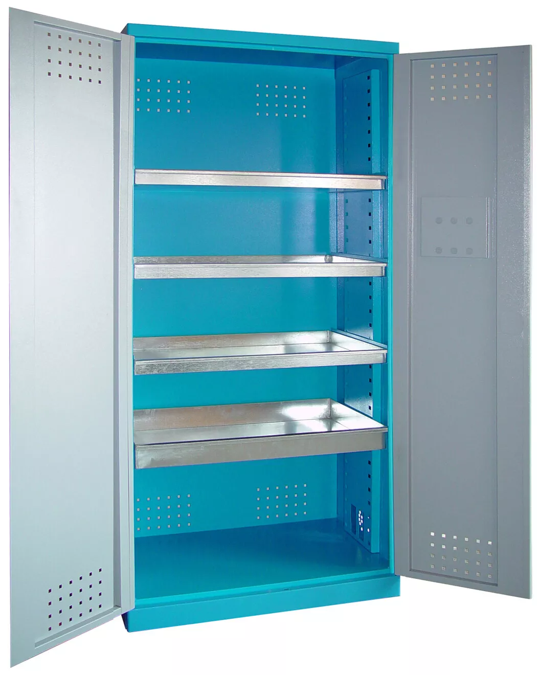 - Vybavení: dvoudveřová skříň (-> uzamykání cylindrickým/rozvorovým zámkem - dvojité uzamčení, 2 klíče); 4 výsuvné vany z pozinkovaného plechu (-> volitelné nastavení výšky, nosnost: 30 kg); systém odvětrávání skříně (-> děrovaný korpus/dveře)