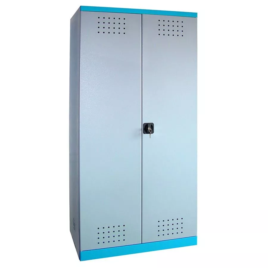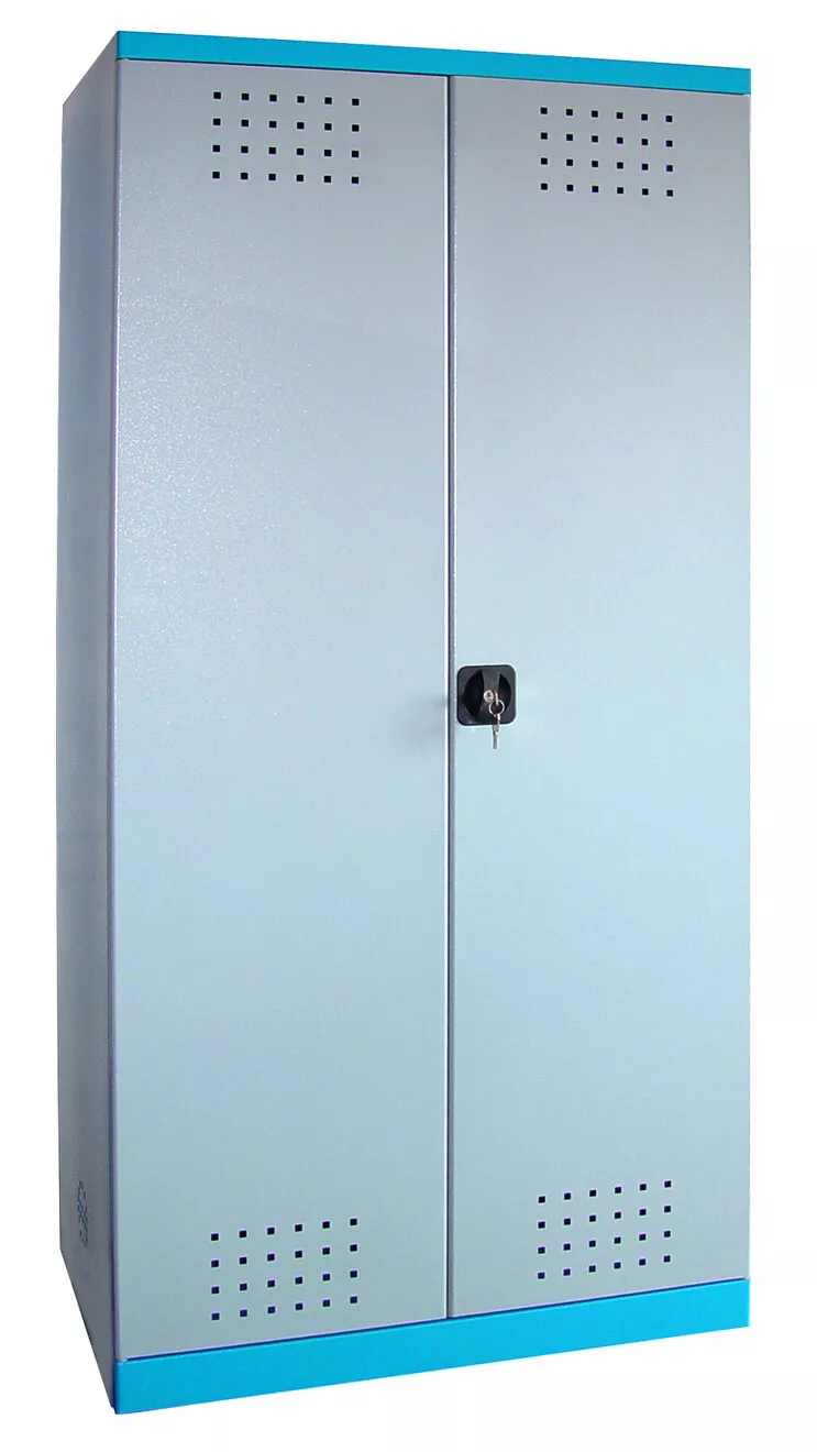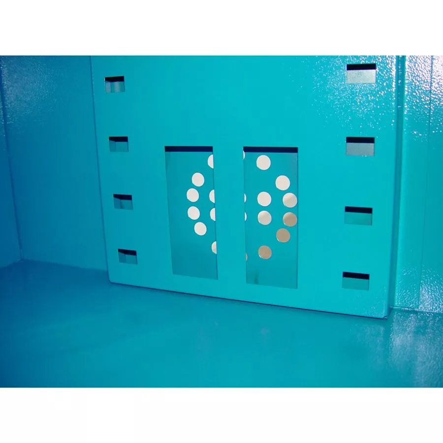 - Vybavení: dvoudveřová skříň (-> uzamykání cylindrickým/rozvorovým zámkem - dvojité uzamčení, 2 klíče); 4 výsuvné vany z pozinkovaného plechu (-> volitelné nastavení výšky, nosnost: 30 kg); systém odvětrávání skříně (-> děrovaný korpus/dveře)