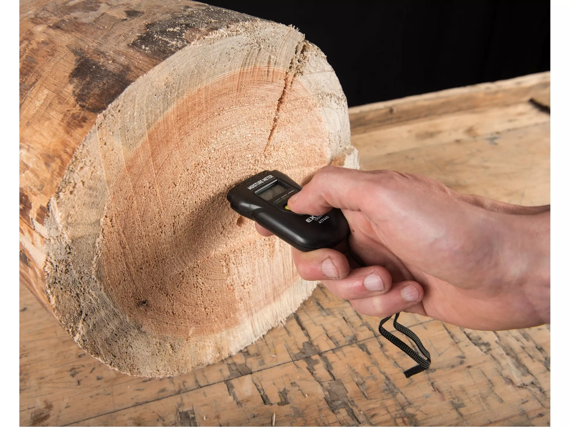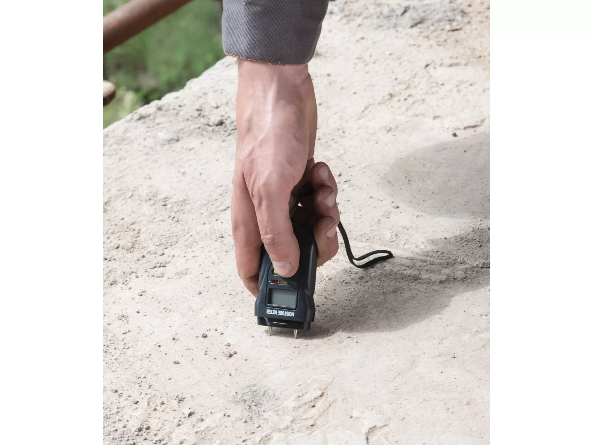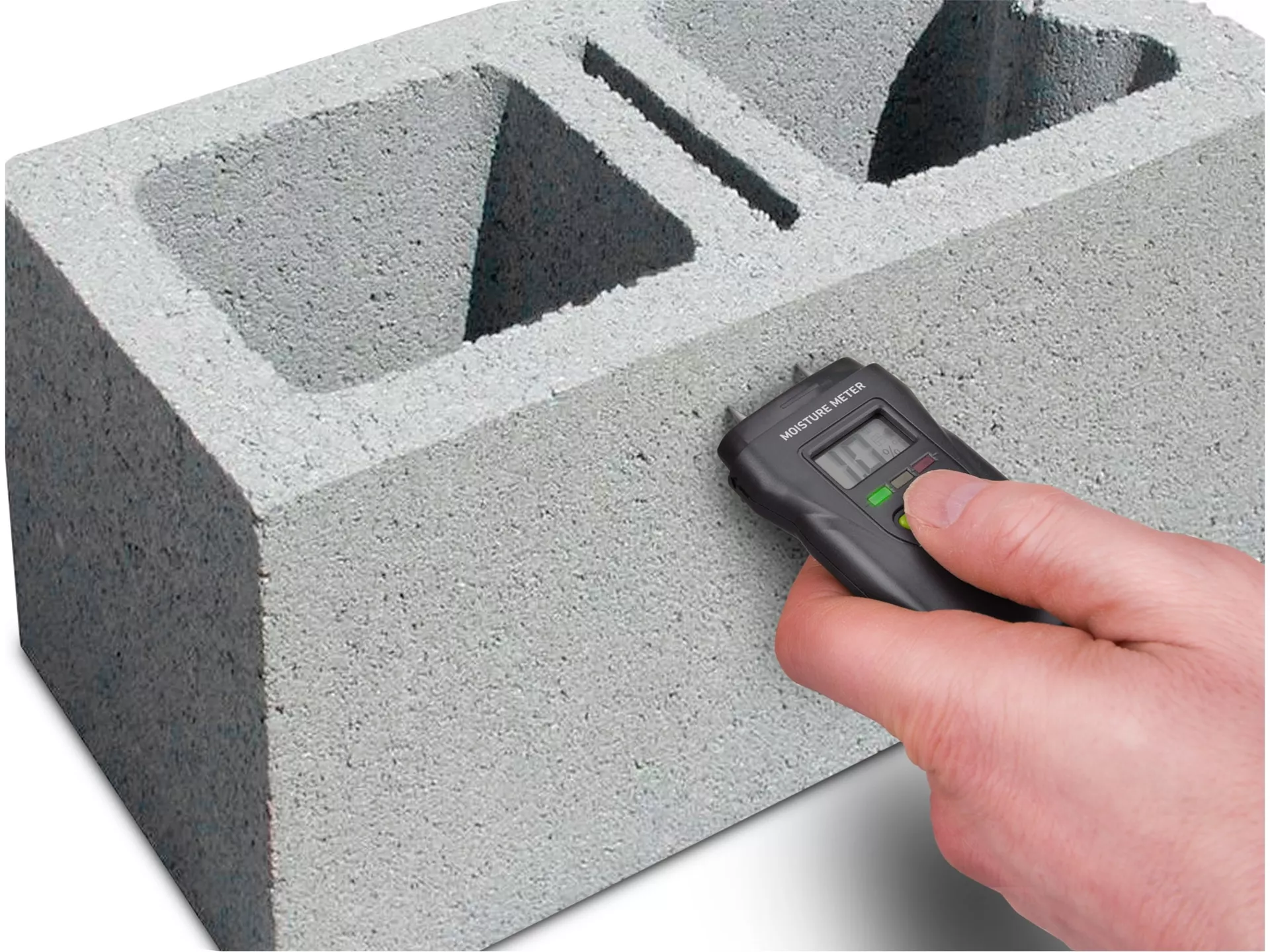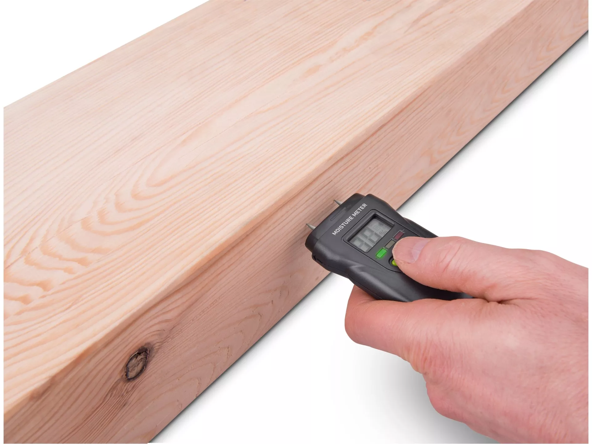 - Vlhkoměr je vhodný pro měření vlhkosti v řezaném dřevě (také v papíru, kartonu) a vytvrzených materiálech (malta, beton a sádra). Zobrazuje také vlhkost nebo teplotu ovzduší. Má tři LEDky, které indikují vlhkost měřeného materiálu.