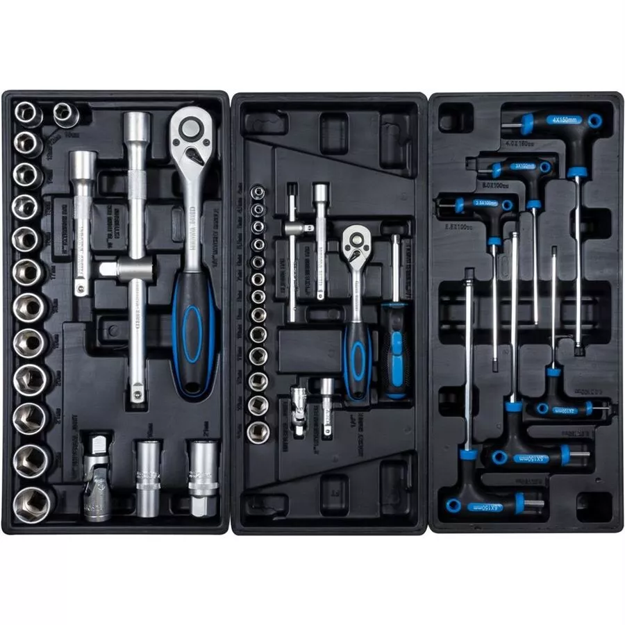 - nosnost až 400 kg Obsah: - zásuvka na nářadí, - zásuvka na nářadí, - zásuvka na nářadí, - zásuvka na nářadí: - 2 oboustranné ráčny 1/2" | 1/4" - 3 nástavce: 1/2" 125 mm | 1/4" 50/100 mm - 2 T-nástavce: 1/2" 250 mm | 1/4" 110 mm - 2 univerzální klouby 1/2" | 1/4" - 2 dlouhé nástrčné hlavice: 1/2" 16/21 mm, délka: 65 mm - 26 nástrčných hlavic: 1/2" 10, 12-22, 24 mm | 1/4" 4, 4,5, 5, 5,5, 6-14 mm - 1 šroubovák se čtyřhrannou hlavou 1/4" - 6 imbusových klíčů s kulovým koncem: 2, 2,5, 3, 4, 5, 6 mm - 4 pojistné kleště: 2 pro vnitřní kroužky, 2 pro vnější kroužky - 3 kleště: Kleště jehlové, boční štípací kleště, kombinované kleště - 1 pár krimpovacích kleští - 160 částečně izolovaných krimpovacích kabelových konektorů - 12 magnetických šroubováků s měkkou rukojetí: SL6*38, SL3*75, SL4/5*100, SL6*150, SL8*175, PH0*75, PH1/2*100, PH2*38, PH2*150, PH3*200 - 1 elektrikářský šroubovák - 6 izolovaných šroubováků: SL3*75, SL4*100, SL5,5*125, PH0*75, PH1/2*100 - 1 skládací sada 8dílných klíčů se šestihranem: T 9 / 10 / 15 / 20 / 25 / 27 / 30 / 40 - 7 přesných šroubováků: PH1.8, PH2, PH2.4, SL1.8, SL2.0, SL2.4, SL3 - 2 kladiva: zámečnické kladivo 300 g, plastové kladivo - 12 očkoplochých klíčů: 8-19 mm Volitelné příslušenství: -#40768 Sada držáků nářadí 28 TLG - #40861 Pouzdro na doklady GD 250 - Všechny držáky nářadí a háky z našeho sortimentu