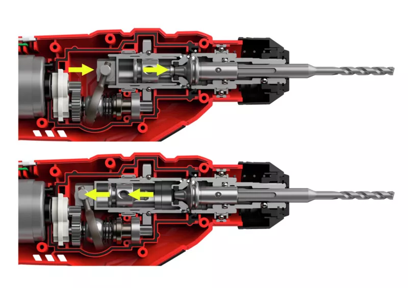 - Příklep se využije při vrtání do betonu; při běžném vrtání a šroubování se příklep vypíná.