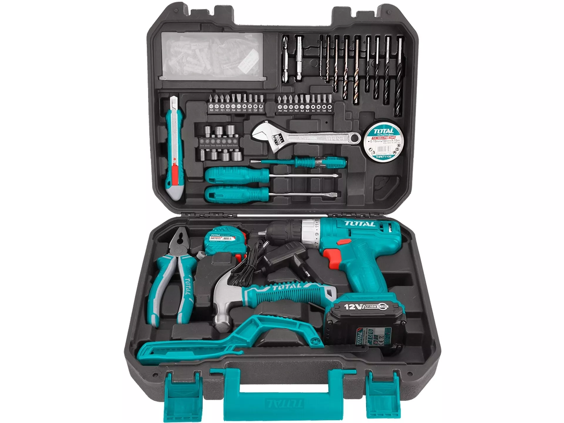- Srdcem této sady nářadí je 12V vrtací šroubovák AKU dodávaný s nabíječkou a 1ks baterie. Šroubovák má 15+1 stupňů momentu, 20Nm, otáčky naprázdno 0-600 min-1 a kapacitu rychloupínacího sklíčidla 0,8-10mm. V sadě dále naleznete CrV hroty, vrtáky, šrouby a hmoždinky. Sada je vybavena ručním nářadím z kvalitních materiálů - šroubováky, mini kladivo, kleště kombinované, nastavitelný klíč, zkoušečka napětí, pila, svinovací 3M metr, ulamovací nůž, magnetický držák hrotů, plastová těsnící páska. Vše je zabaleno v kufru.