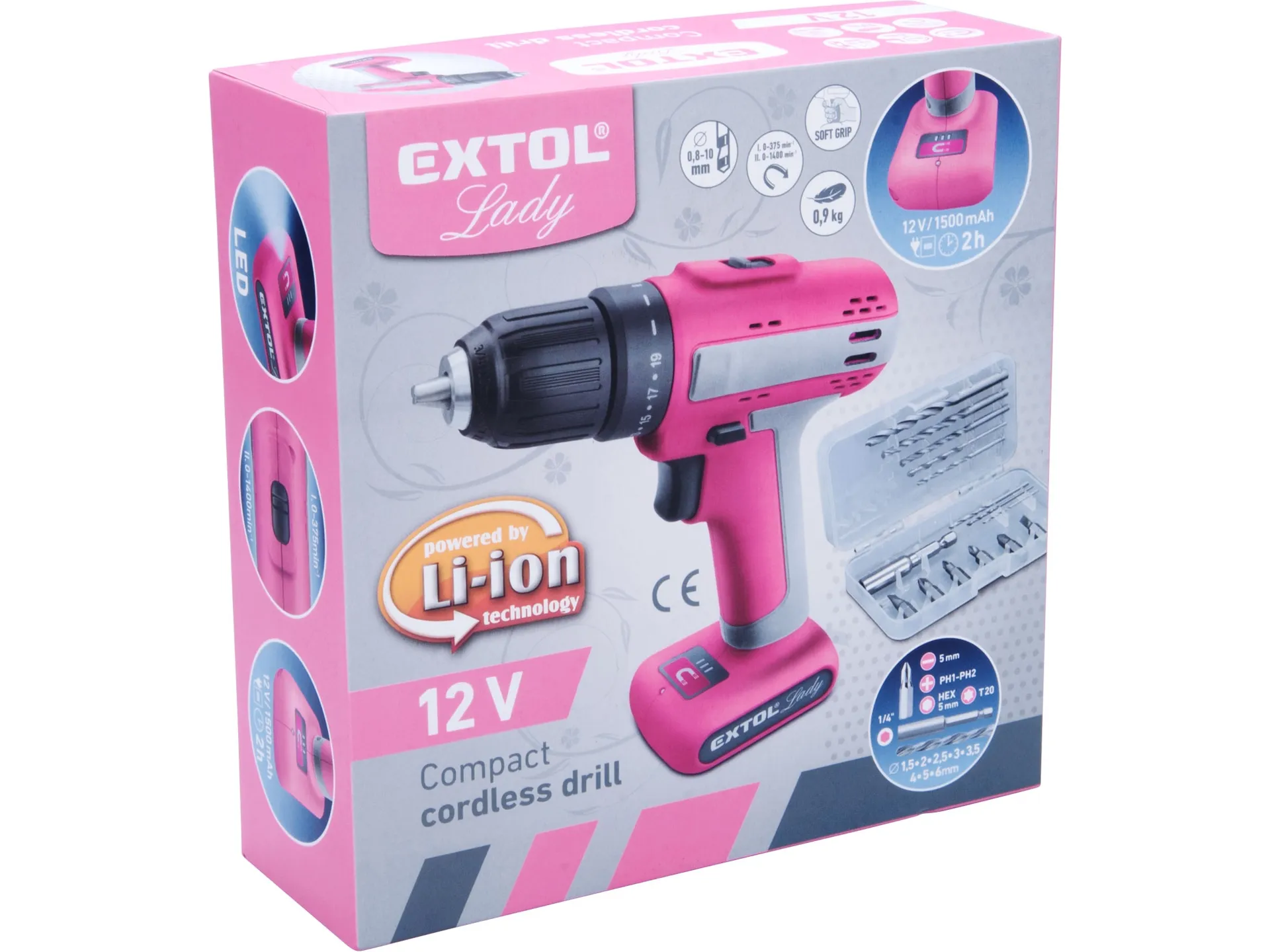 Vrtací šroubovák aku, růžový, 12v li-ion, 1500mah EXTOL LADY 402402