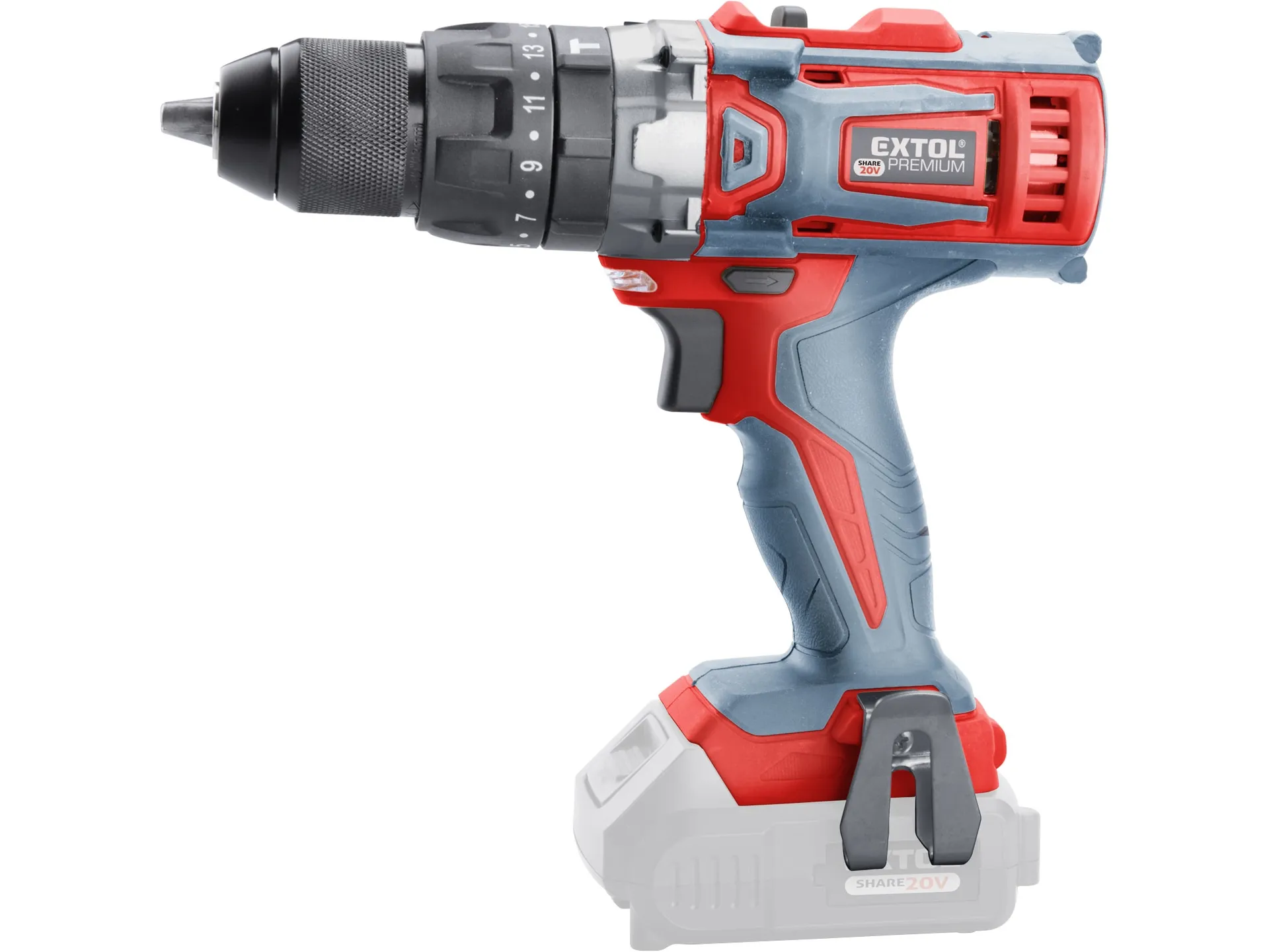 Vrtací šroubovák aku s příklepem share20v, 20v li-ion, bez baterie, nabíječky a kufru EXTOL PREMIUM 8891805