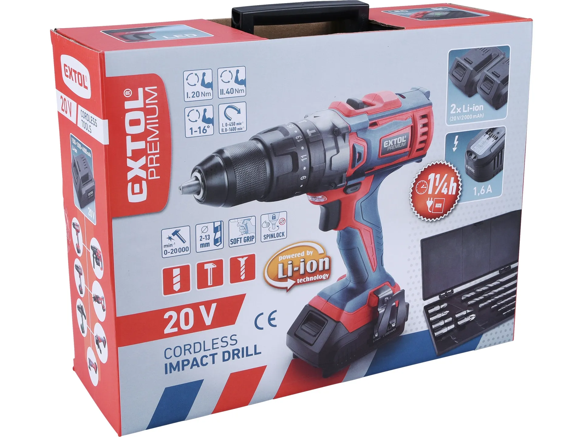 Vrtací šroubovák aku share20v, 20v li-ion (2×), 1500mah EXTOL PREMIUM 8891802