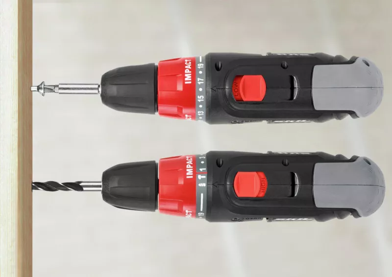 - Nastavení „High speed“ nabízí velkou rychlost při vrtání, zatímco nastavení „Low speed“ vysoký krouticí moment pro náročné šroubování (například velkých šroubů).
