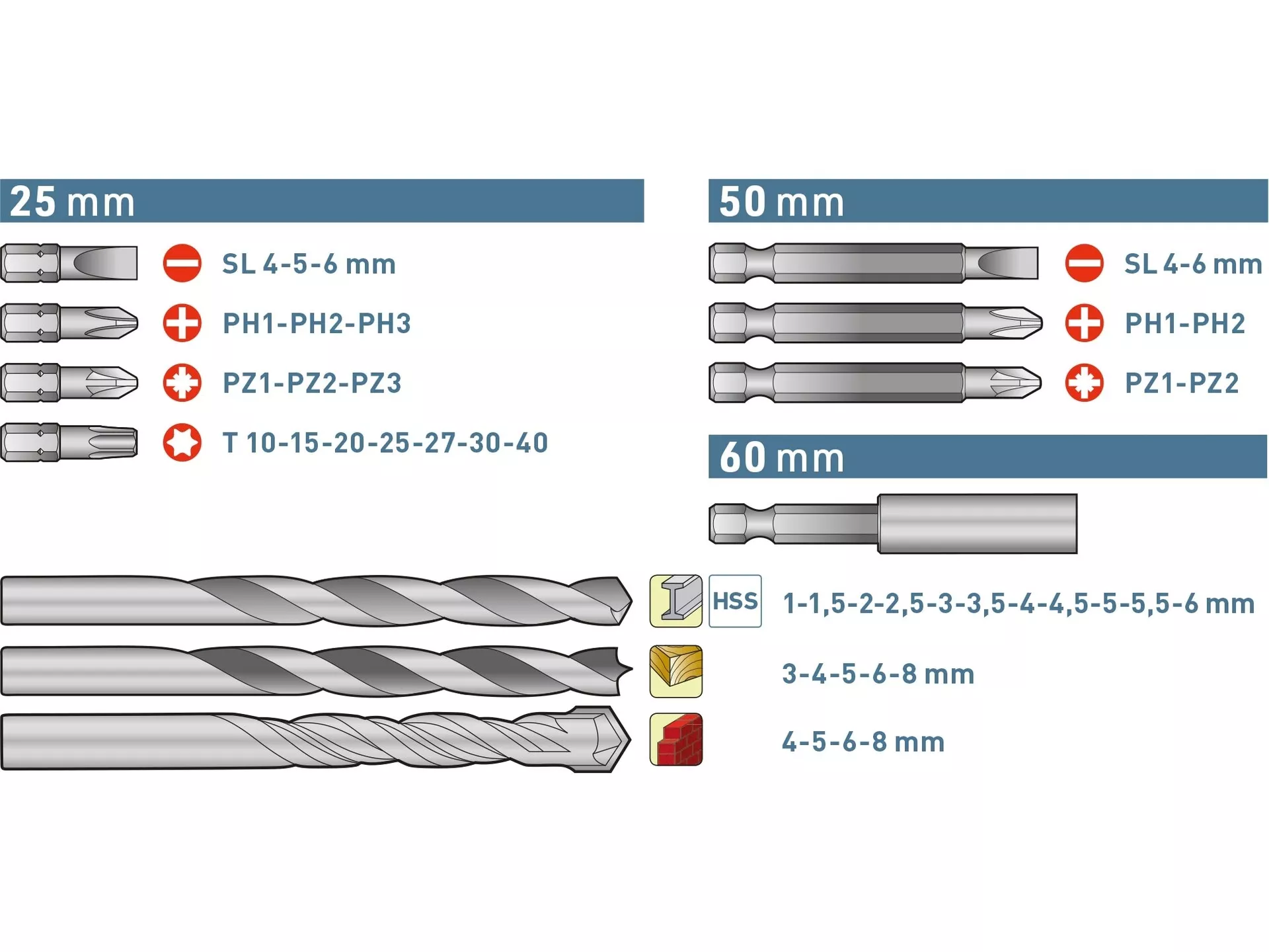 - Doplňující parametr: vrtáky do kovu: O 1-1,5-2-2,5-3-3,5-4-4,5-5-5,5-6mm, vrtáky do dřeva: O 3-4-5-6-8mm, vrtáky do zdiva: O 4-5-6-8mm, hroty: 1/4"x25mm (-) 4-5-6mm, PH1-2-3, PZ1-2-3, TORX10-15-20-25-27-30-40