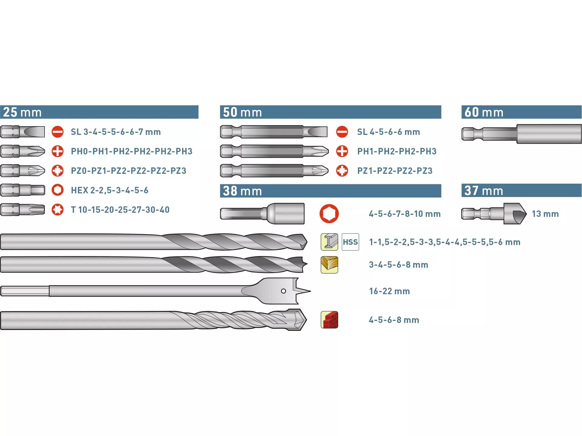 - Doplňující parametr: HEX2-2,5-3-4-5-6mm, TORX10-15-20-25-27-30-40, hroty 1/4"x50mm (-)4-5-6-6mm, PH1-2-2-3, PZ1-2-2-3, držák 1/4" hrotů 60mm, nástrčné, hlavice do vrtačky 1/4"x38mm 4-5-6-7-8-10m, záhlubník 1/4"x37mm průměr 13mm, vrtáky do kovu, 1-1,5-2-2,5-3-3,5-4-4,5-5-5,5-6mm, vrtáky do dřeva 3-4-5-6-8mm, vrtáky ploché do dřeva 16-22mm, vrtáky do zdiva 4-5-6-8mm, hroty 1/4"x 25mm (-)3-4-5-5-6-6-7mm, PH0-1-2-2-2-3, PZ0-1-2-2-2-3