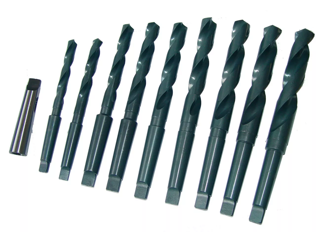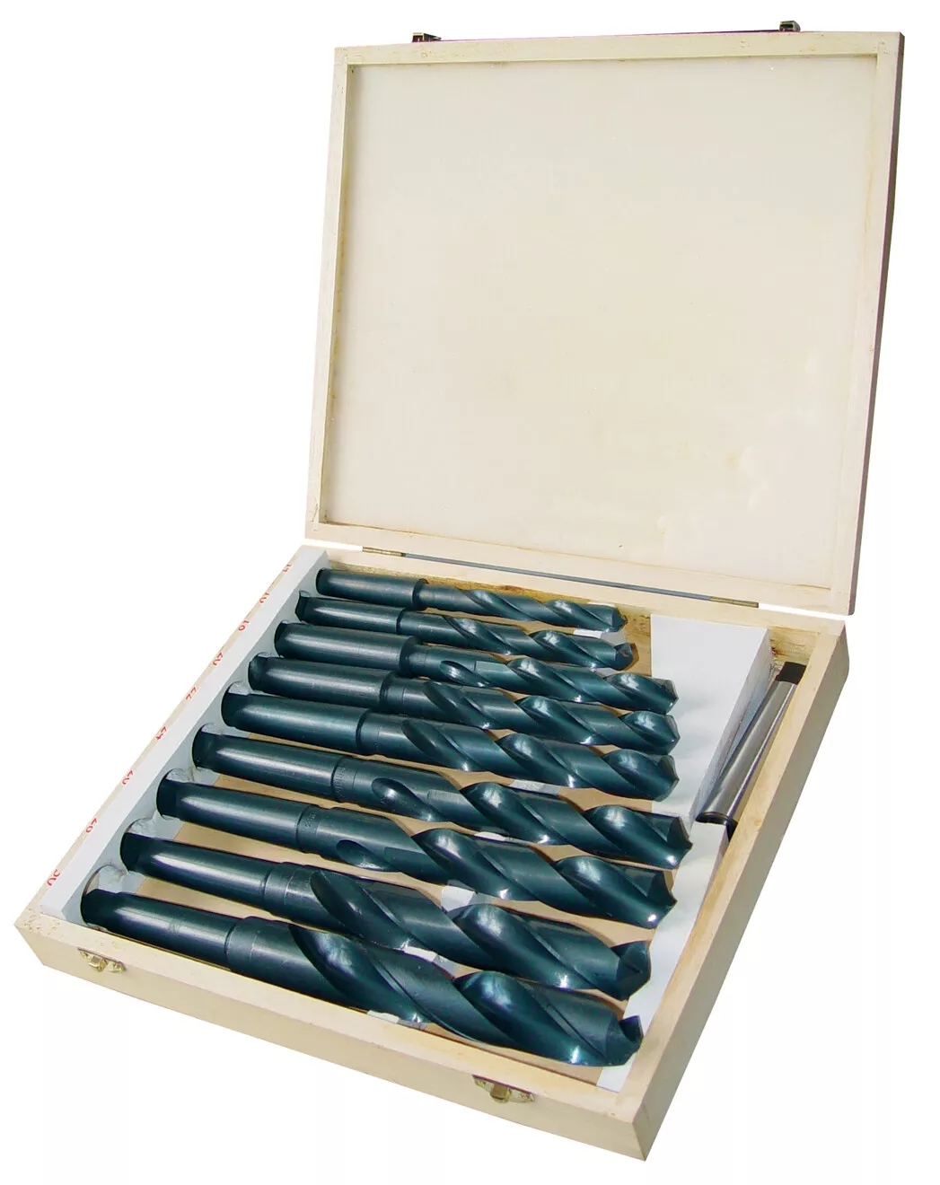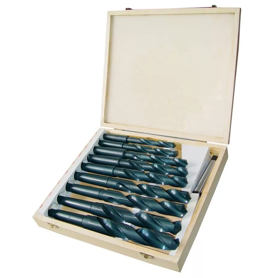 - Sada válcovaných vrtáků s kuželovými stopkami MK1 až MK3, určených k vrtání oceli, legované (nelegované) lité oceli, ocelolitiny, litiny, barevných kovů (mosaz, bronz) apod.Spirálové vrtáky (pravotočivá šroubovice), úhel špice 118°, v černém povrchovém provedení.Složení sady: vrtáky MK1 - 14 mm, MK2 - 16 mm, MK2 - 18 mm, MK2 - 20 mm, MK2 - 22 mm, MK3 - 24 mm, MK3 - 26 mm, MK3 - 28 mm, MK3 - 30 mm, redukční pouzdro MK2 - MK1, dřevěná kazeta