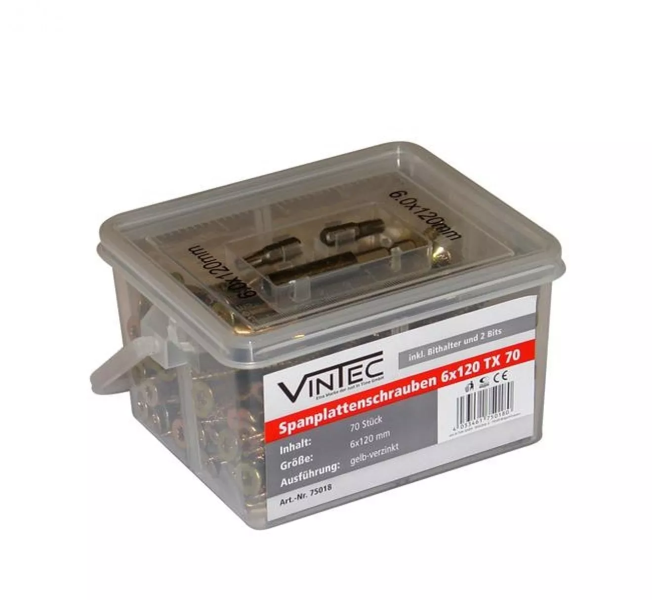 - 70 ks pozinkovaných vrutů 6 x 120 mm, hlavička Torx TX 70, 1 x držák bitů, 2 x bit TX 70