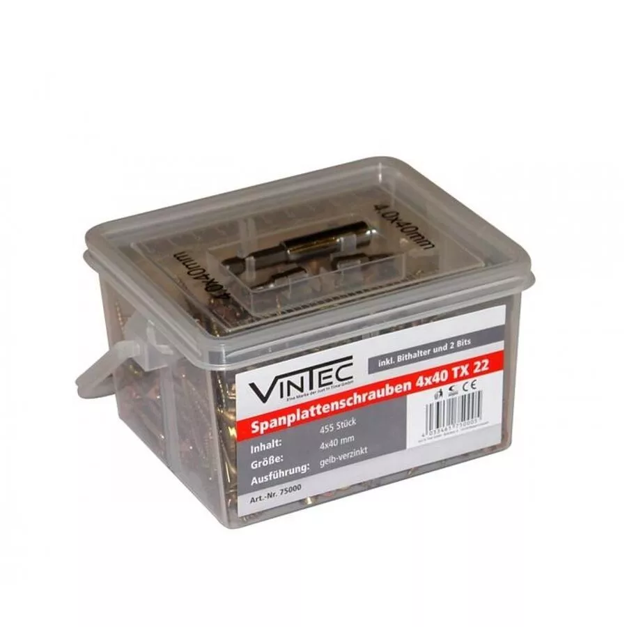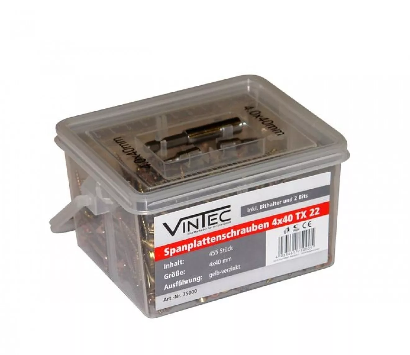 - 455 ks pozinkovaných vrutů 4 x 40 mm, hlavička Torx TX 22, 1 x držák bitů, 2 x bit TX 22