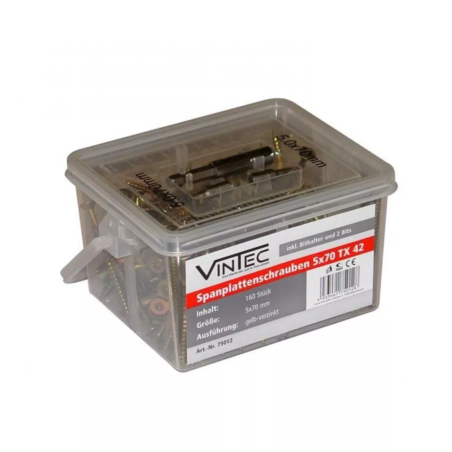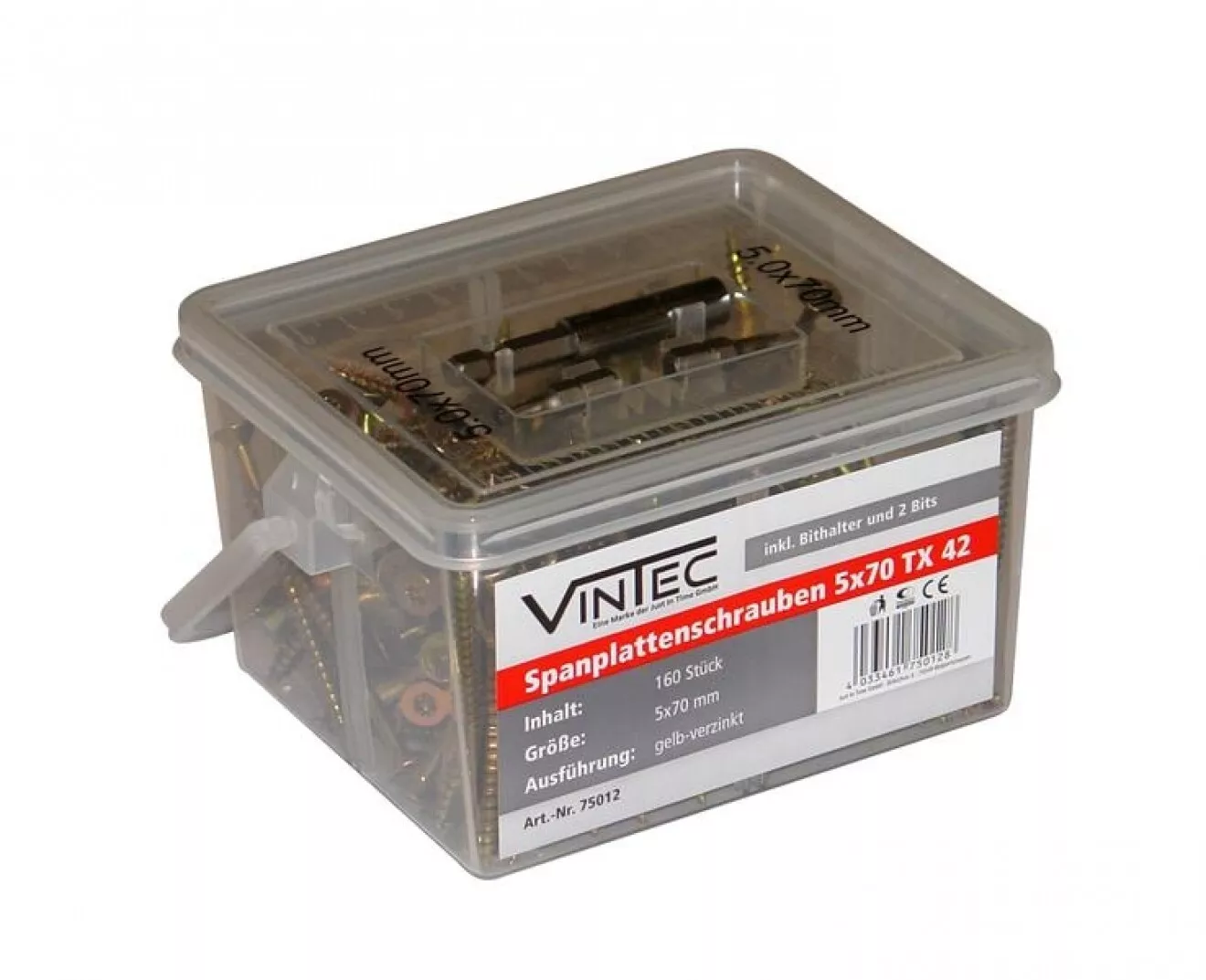 - 160 ks pozinkovaných vrutů 5 x 70 mm, hlavička Torx TX 42, 1 x držák bitů, 2 x bit TX 42