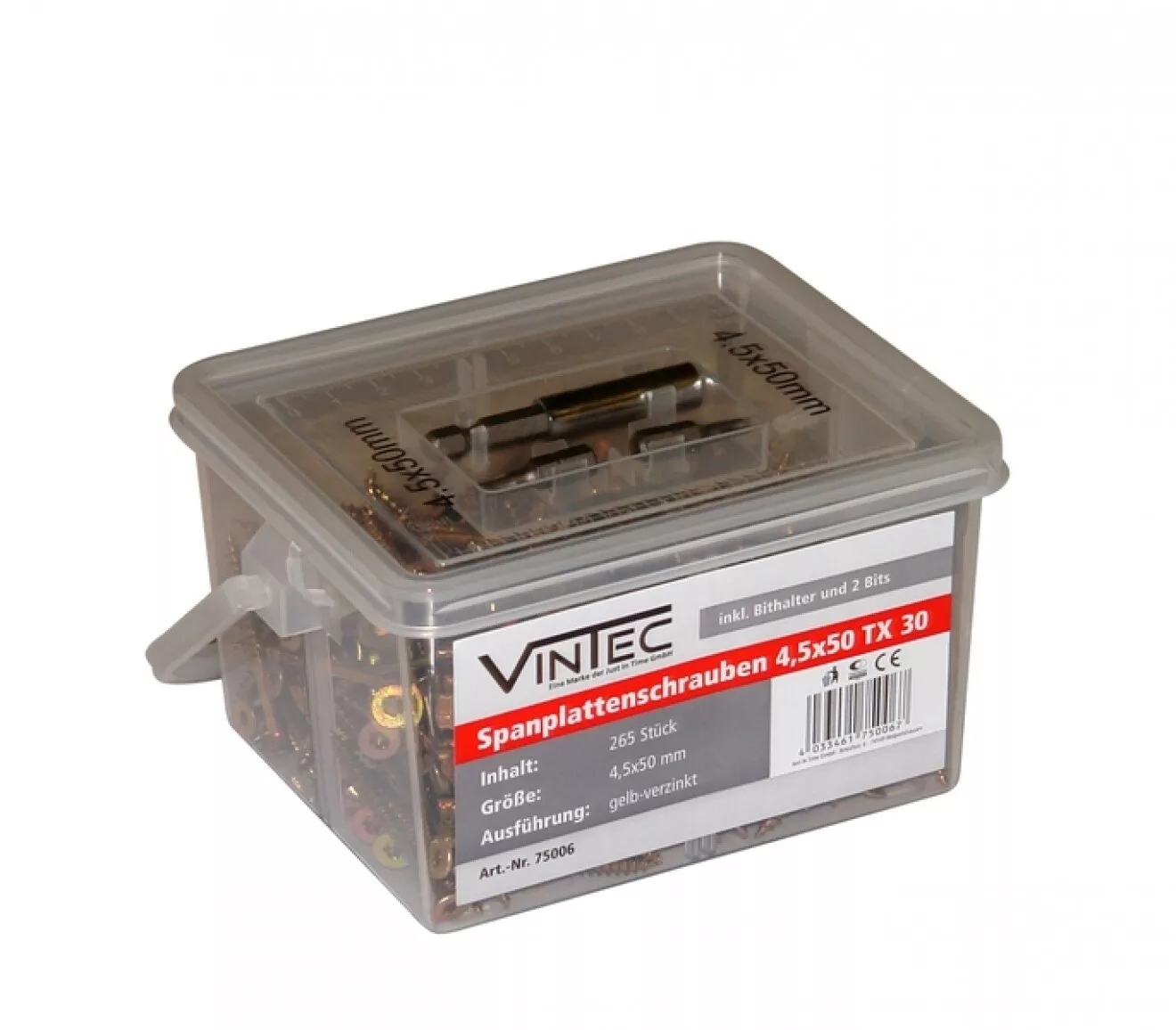 - 265 ks pozinkovaných vrutů 4,5 x 50 mm, hlavička Torx TX 30, 1 x držák bitů, 2 x bit TX 30