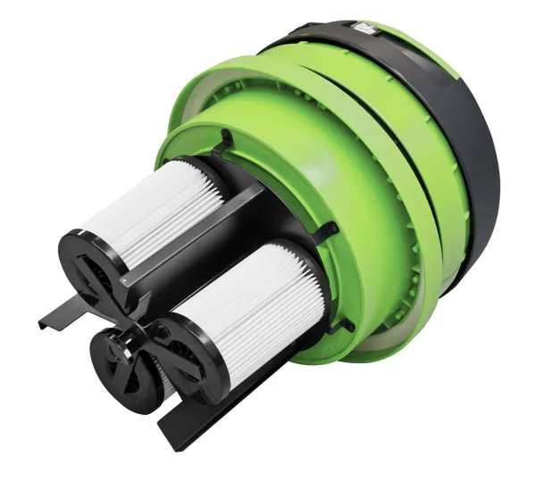 - Tři motory s kazetovými filtry. Vysavač pracuje cyklicky se dvěma motory, resp. filtry, zatímco třetí filtr se čistí během provozu. Automatický cyklus čistí během provozu všechny filtry bez ztráty sacího výkonu