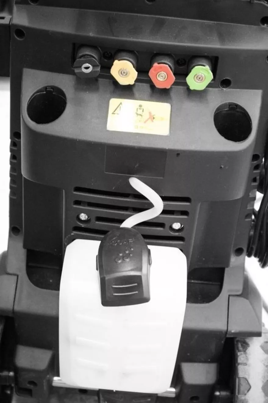 - ocelového nástavce se sadou trysek (4), frézy na hrubé nečistoty, kartáčů (2) a čističe ploch.Řízené dávkování čisticího prostředku, naviják tlakové hadice, pojezdová kola pro pohodlné přesouvání myčky z místa na místo