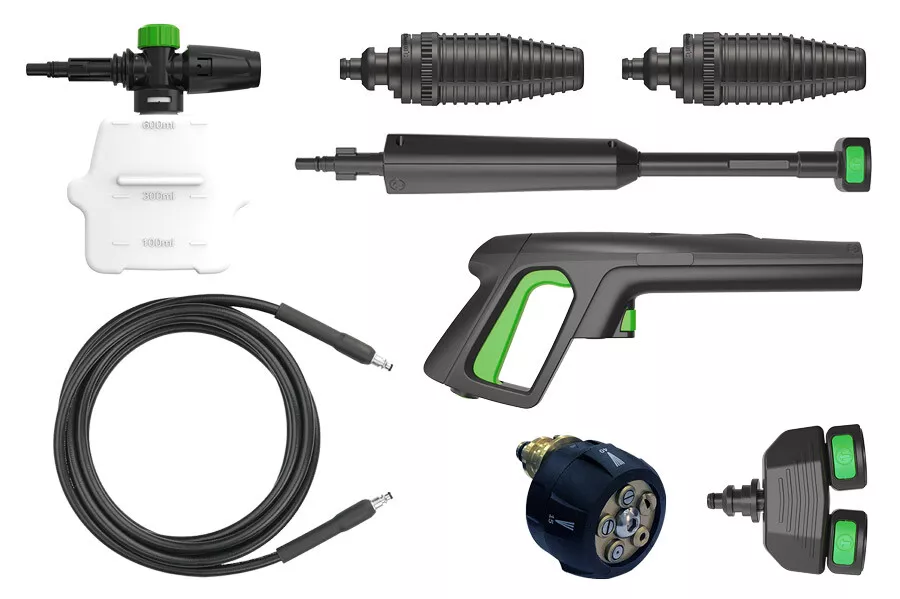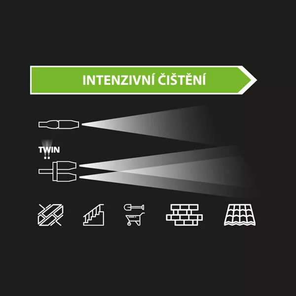 - Samonasávací akumulátorová tlaková myčka, akumulátor 20 V / 2 Ah (není součástí).