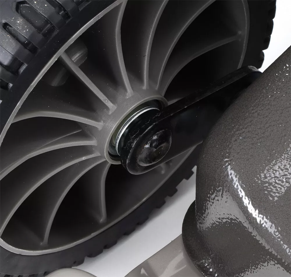 - Pogumovaná sendvičová kola jsou uložena v oboustranných kuličkových ložiscích, centrální nastavení výšky sečení je u této značky samozřejmostí. Velkým nadstandardem u této sekačky je použita speciální třecí spojka na noži sekačky pod unášečem,