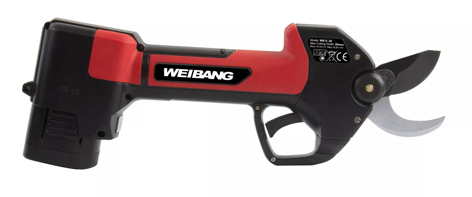 - Zahradní nůžky Weibang WB E-30 jsou jedny z nejlehčích akumulátorových nůžek s šířkou řezu 30mm. Čepele jsou vyrobeny z vysoce uhlíkové oceli, která je dokončena teflonovým povlakem. Tento způsob zpracování zahradních nůžek slouží k výraznému snížení síly střihu v důsledku doby používání. Každá baterie je schopna na jedno nabití vytvořit až 2800 střihů. Průměrná pracovní doba na jedno nabití až 4 hodiny.