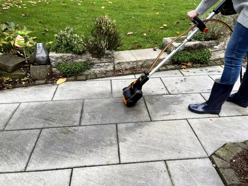 - Systém s rychle výměnnými kartáči k čištění chodníků, kamene, dřeva, plevele a umělé trávy.
