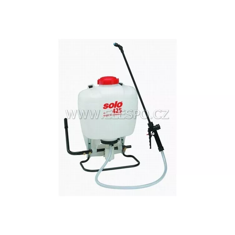- Zádový tlakový postřikovač SOLO 425 s nádrží na postřik o objemu 15 l. Je vhodný pro aplikaci postřiků na ochranu rostlin a různých čistících a dezinfekčních prostředků. Postřikovač je vyrobený z pevných lehkých plastů odolných proti záření UV. Postřiková kapalina se tlakuje ve vzdušníku uvnitř nádrže pomocí tlakovací páky. Tlakovací páka se dá nainstalovat vlevo nebo vpravo - dle potřeby obsluhy - levák nebo pravák. Tlakuje se průběžně při aplikaci. Postřikovač je vybavený pístovým čerpadlem. Tvar nádrže je uzpůsobený k pevnému dosednutí na záda a na nádrži je vyznačená stupnice množství obsahu kapaliny. Postřikovač je nesený na širokých polstrovaných popruzích. Hadice mezi nádrží a ovládacím ventilem integrovaným v rukojeti je dlouhá asi 150 cm a umožňuje tak široký rádius ovládání. Součástí dodávky je štěrbinová tryska pro plošný postřik a tryska pro kruhový postřik (dutý kužel).