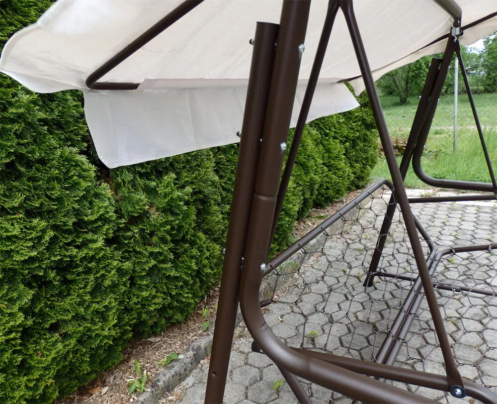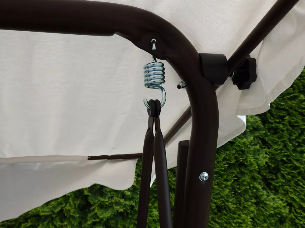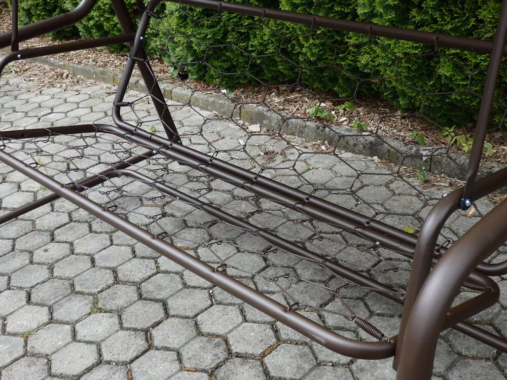 - Kovová konstrukce podsedáku a opěradla je pro pohodlnost uživatelů vyplněna odpruženou drátěnou výztuhou. Masivní čalounění o síle 80 mm plně dokresluje charakter pohodlné luxusní houpačky pro ty nejnáročnější uživatelé.