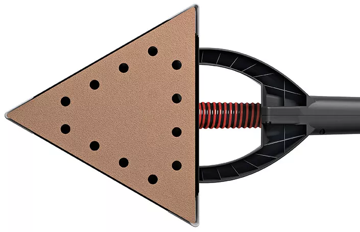 - Brusná hlava ve tvaru trojúhelníku s 4 mm zdvihem, optimálně vhodná pro opracování rohů a hran. Díky orbitálnímu pohybu je možné brousit až do koutů. Otočení brusné hlavy do koutů se docílí pouze pohybem stroje bez přerušení práce