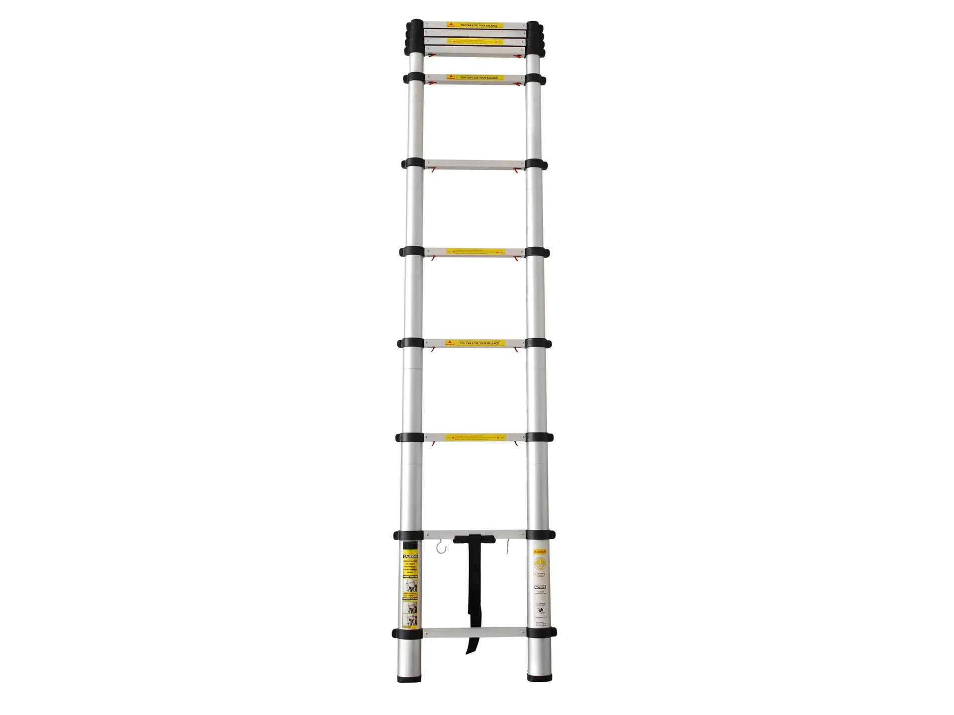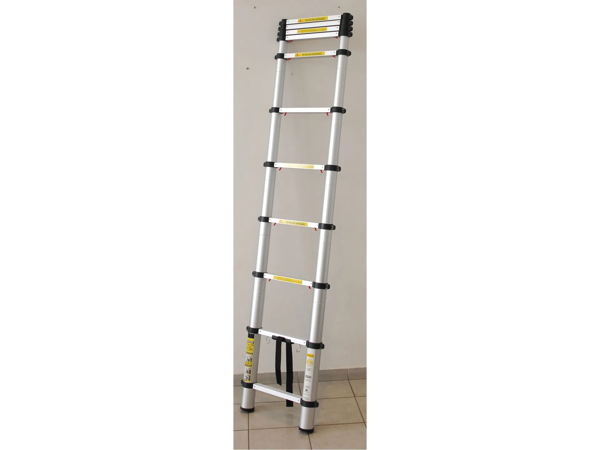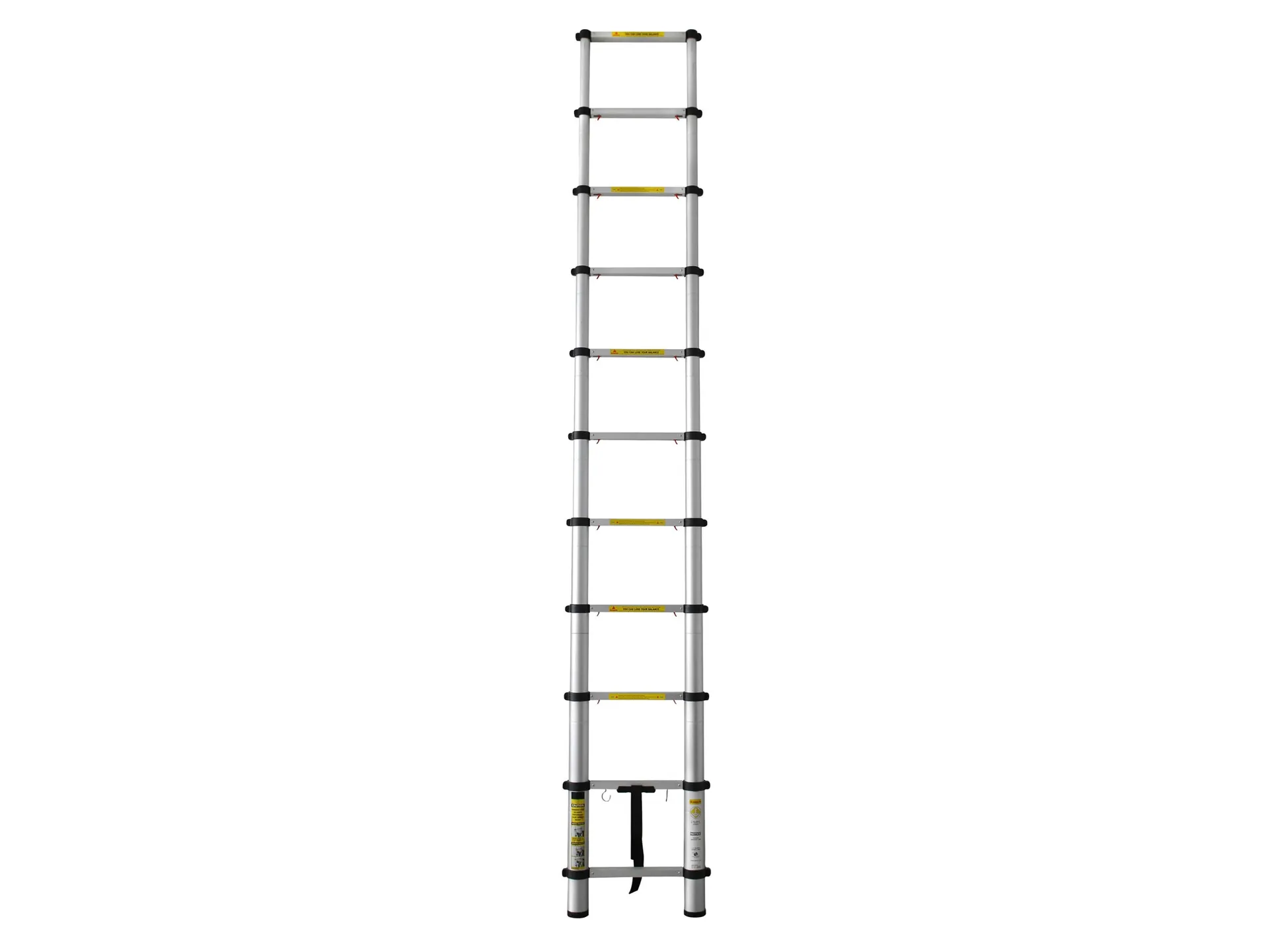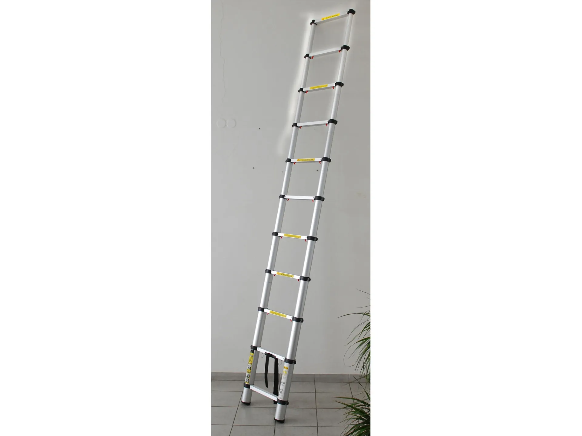 - Doplňující parametr: max. výška 3,8m, výška složeného žebříku 0,79m, nosnost 150kg, 13 příček (12 nastavitelných délek), hmotnost 11,2kg, max. šířka 51cm, šířka žebříku v místě dotyku se zemí 47,5cm