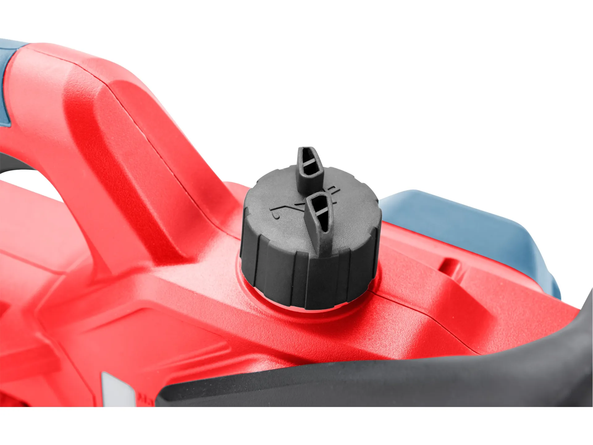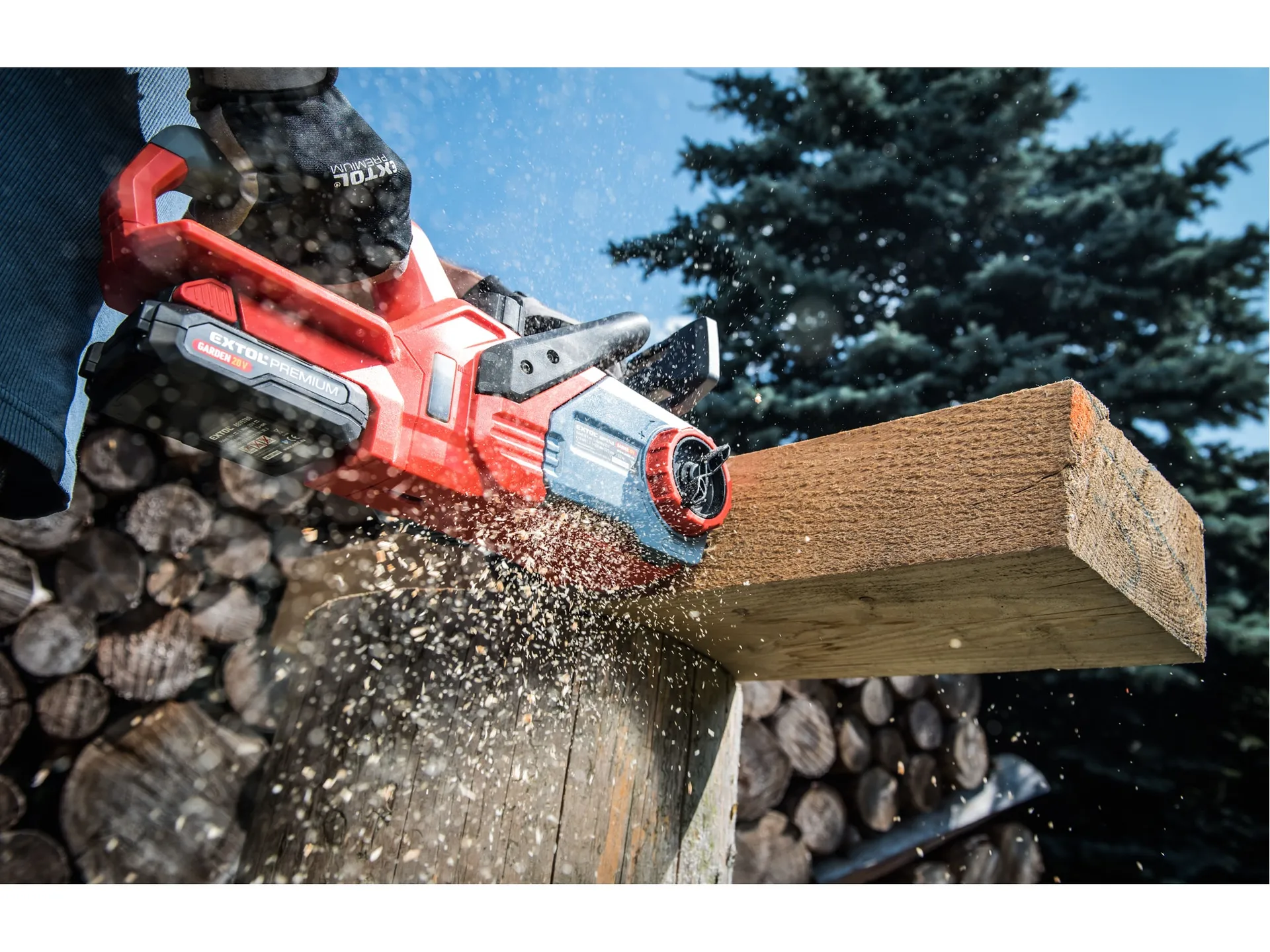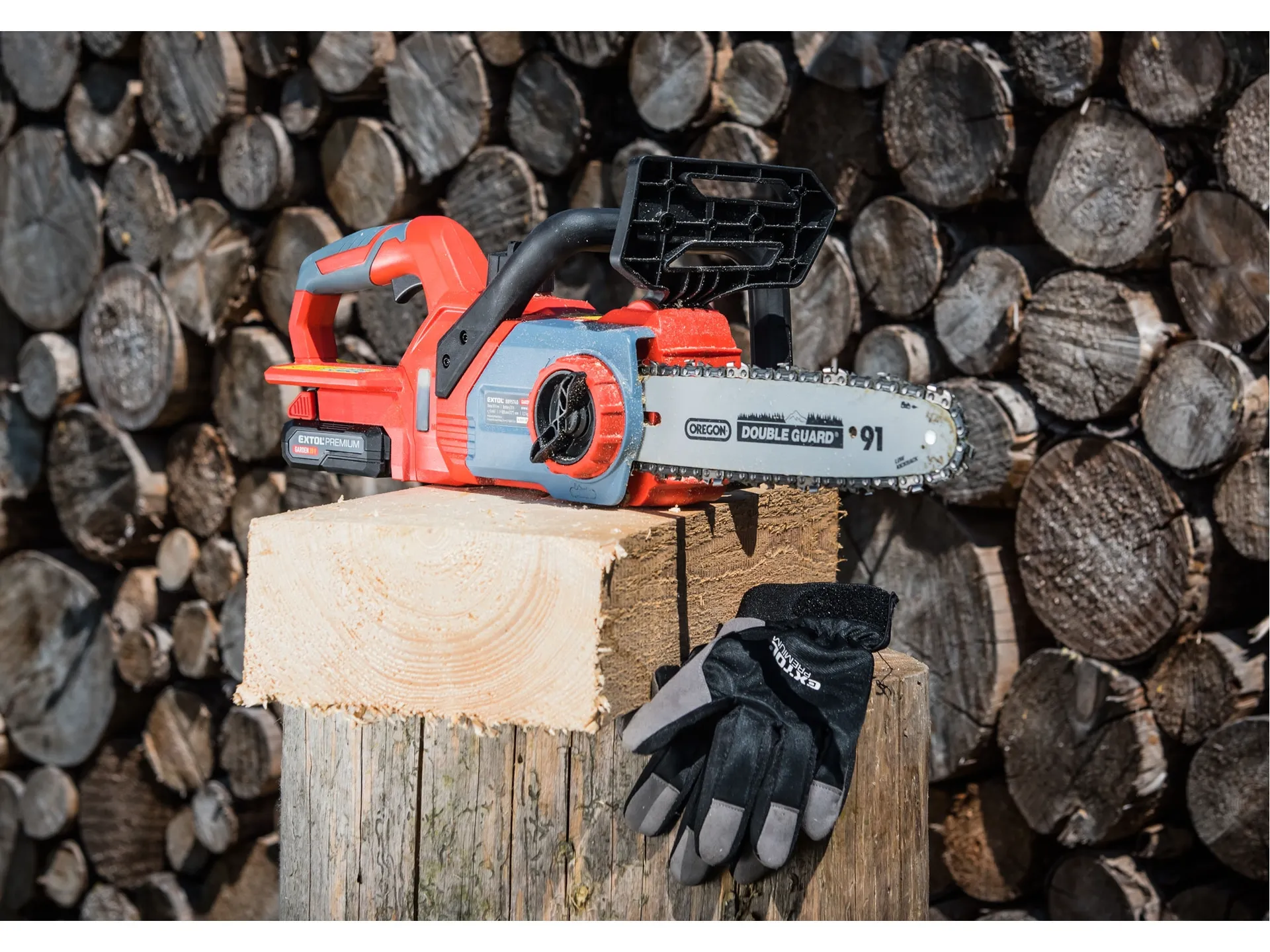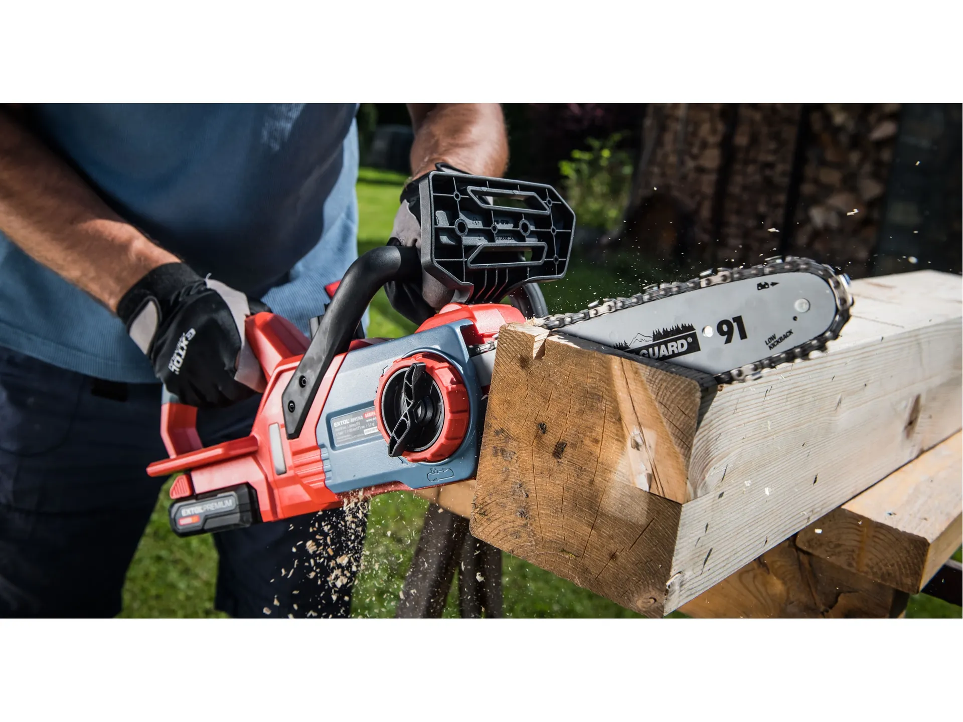 - Řetězová aku pila je určena k provádění zkracovacích řezů dřeva, jako je např. řezání trámů, kácení stromů s přiměřeně silným kmenem, k odvětvování kmenů, k řezání kmenů či silných větví na palivové dřevo. Aku řetězová pila spojuje výhody elektrických pil — nízký hluk, jednoduchost obsluhy a údržby se svobodou pohybu u benzínových pil. Je vybavena kvalitní značkovou vodící lištou a pilovým řetězem OREGON®. Pilová lišta má patentovanou technologii Double Guard® s funkcí omezení zpětného vrhu „Low kickback“. Mazaní řetězu za chodu je automaticky zajišťováno čerpadlem. Pila je také vybavena systémem pro snadnou a rychlou výměnu řetězu a mechanizmem pro snadné vypnutí řetězu. Stroj je vybaven bezpečnostní pojistkou, která se aktivuje při vyklouznutí z rukou nebo při “kopnutí” pily a elektronickou doběhovou brzdou, která zajistí jeho rychlé zastavení. Pogumovaná rukojeť brání vysmeknutí, tlumí vibrace a zpříjemňuje držení při práci. Akumulátor je vybaven ukazatelem nabití, což umožňuje uživateli si rozvrhnout délku práce a dát si včas nabít další akumulátor. Díky použité Li-ion technologii je ho možné kdykoliv dobíjet, aniž by se tím snižovala jeho kapacita. Li-ion akumulátor ztrácí energii vlivem samovybíjení velmi pomalu a vydrží dlouho nabitý a připravený k použití.