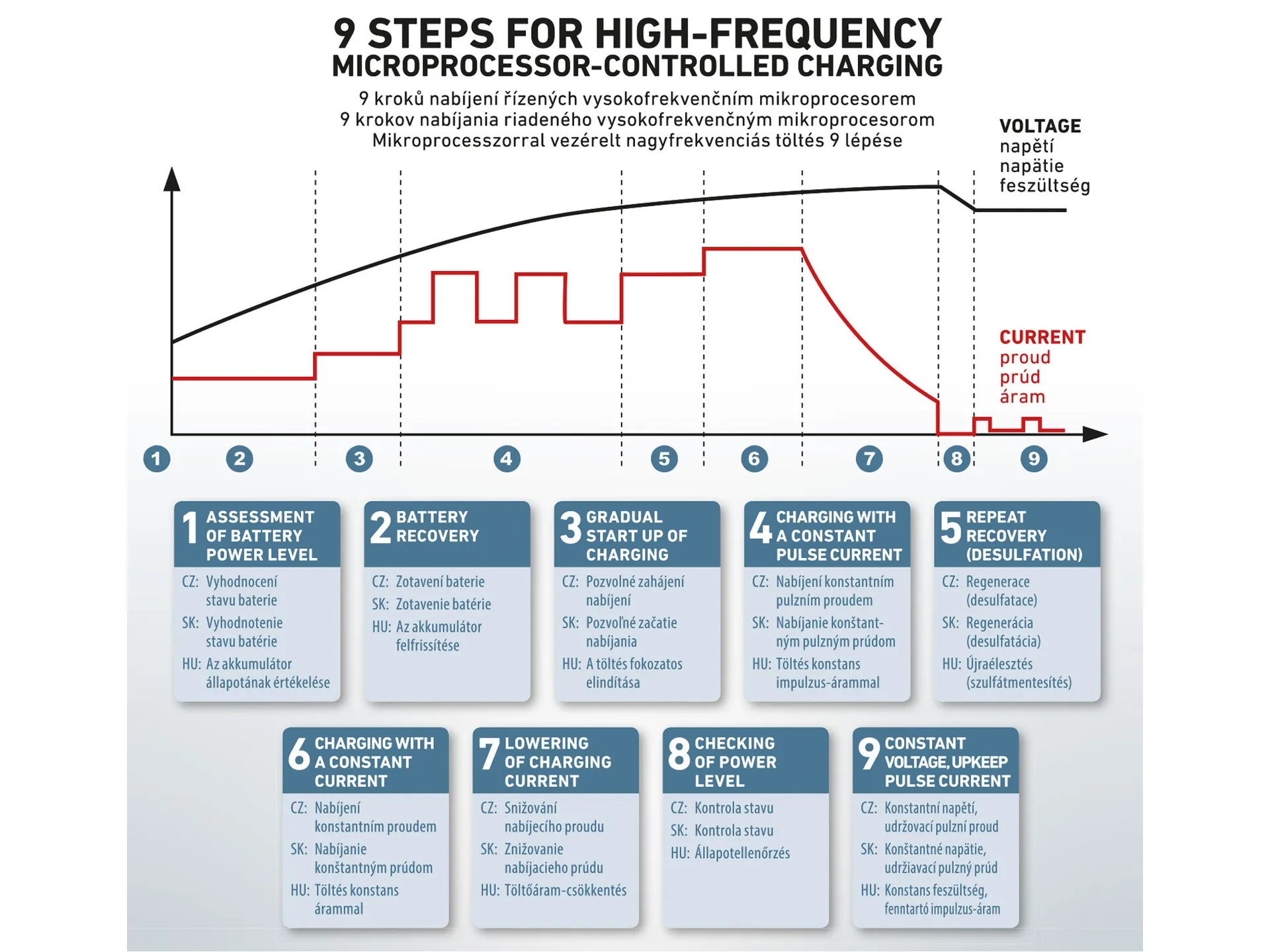 - Nabíječka je určena pro nabíjení 12V nebo 6V olověných akumulátorů se zaplavenou elektrodou WET i Calcium, MF VRLA akumulátorů, AGM, i gelových v rozsahu jmenovité kapacity baterií 1,2 – 80Ah. Pro svou práci využívají automatický přepínací mód o vysoké frekvenci. Vestavěný mikroprocesor v naprogramovaných devíti fází procesu zajistí nabití baterií až do 100% jejich originální kapacity. Umožňuje automaticky (nebo volitelně) znovuoživení částečně sulfátovaných baterií. Nabíjí a zachraňuje vyčerpané baterie. V automatickém udržovacím módu dodává bateriím pouze tolik potřebné energie, která se rovná jejímu samovybíjecímu proudu, takže umožní uživateli ponechat baterii spojenou s nabíječkou i po několik měsíců a udržet ji ve stále plném stavu nabití. 9 nabíjecích stupňů 1-vyhodnocení stavu baterie2-zotavení baterie3-pozvolné zahájení nabíjení4-nabíjení konstantním pulzním proudem5-regenerace(desulfatace)6-nabíjení konstantním proudem7-snižování nabíjecího proudu8-kontrola stavu9-konstantní napětí, udržovací pulzní proud