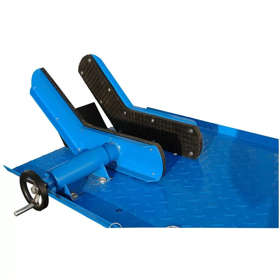 - (-> maximální nosnost: 560 kg).Pohodlné zvedání/plynulé spouštění plošiny pomocí pedálů (2), bezpečná fixace předního kola motocyklu prostřednictvím pohyblivé upínací svorky (-> max